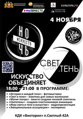 4 ноября в КДК «Виктория» состоялась ежегодная всероссийская акция «Ночь искусств». Центральной темой мероприятия стала «Свет и тень», которая нашла отражение во всех творческих площадках.